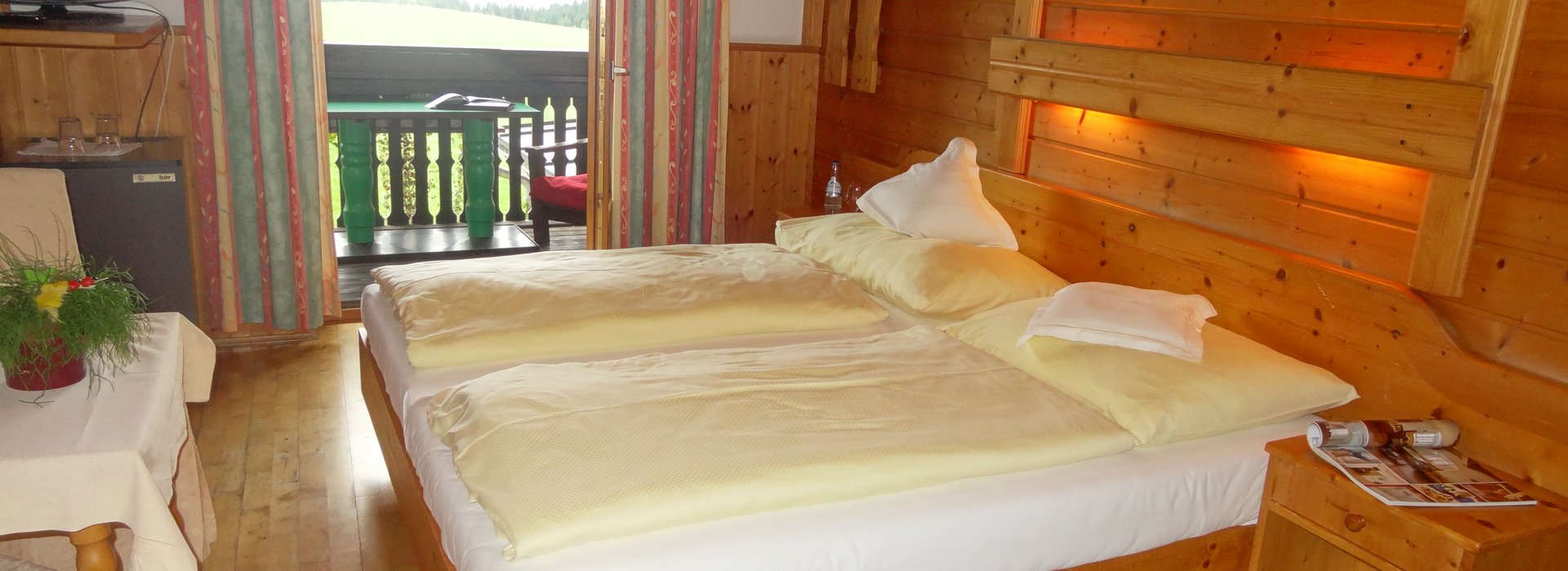 Die hellen, freundlichen Einzel-, Doppel- bzw. Familienzimmer sind alle mit sehr viel Holz eingerichtet. Selbstverständlich sind alle Zimmer mit Dusche, WC, Haartrockner, Sat-TV, Kühlschrank und Safe ausgestattet. Die wohnlich eingerichteten Gästezimmer, zum Großteil mit Balkon bieten einen prachtvollen Ausblick auf das Koralpenmassiv.